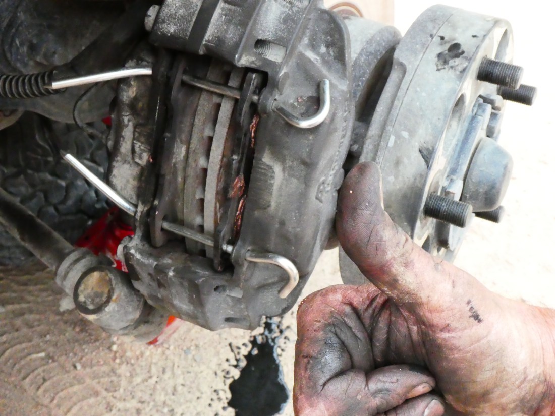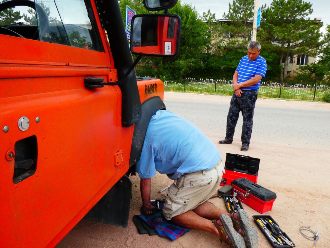 These guys were a great help in advising where to get replacement pins ,which were available to order but a two week wait ! Leigh introduced me to a local 4wd specialist who ran a workshop in Almaty. Thinking they might have some secondhand bits and pieces I arrived full of hope but no luck as Landrover Defenders are a rarity in these parts ,with Toyota’s being the most popular and no chance of parts compatibility. So I had a rummage around in their old nuts and bolts heap and found some used bolts which were the right dimensions and with a little grinding down and drilling holes, bugger me ,we have pad retaining pins! I reassembled the brakes and then spent the rest of the day having a maintenance day checking oils, changing rubber bushes on steering damper,and a general grease around having had engine oil change earlier, I’m happy that we are fit to hit the road again and ready for the next adventure packed day, what ever it might bring!