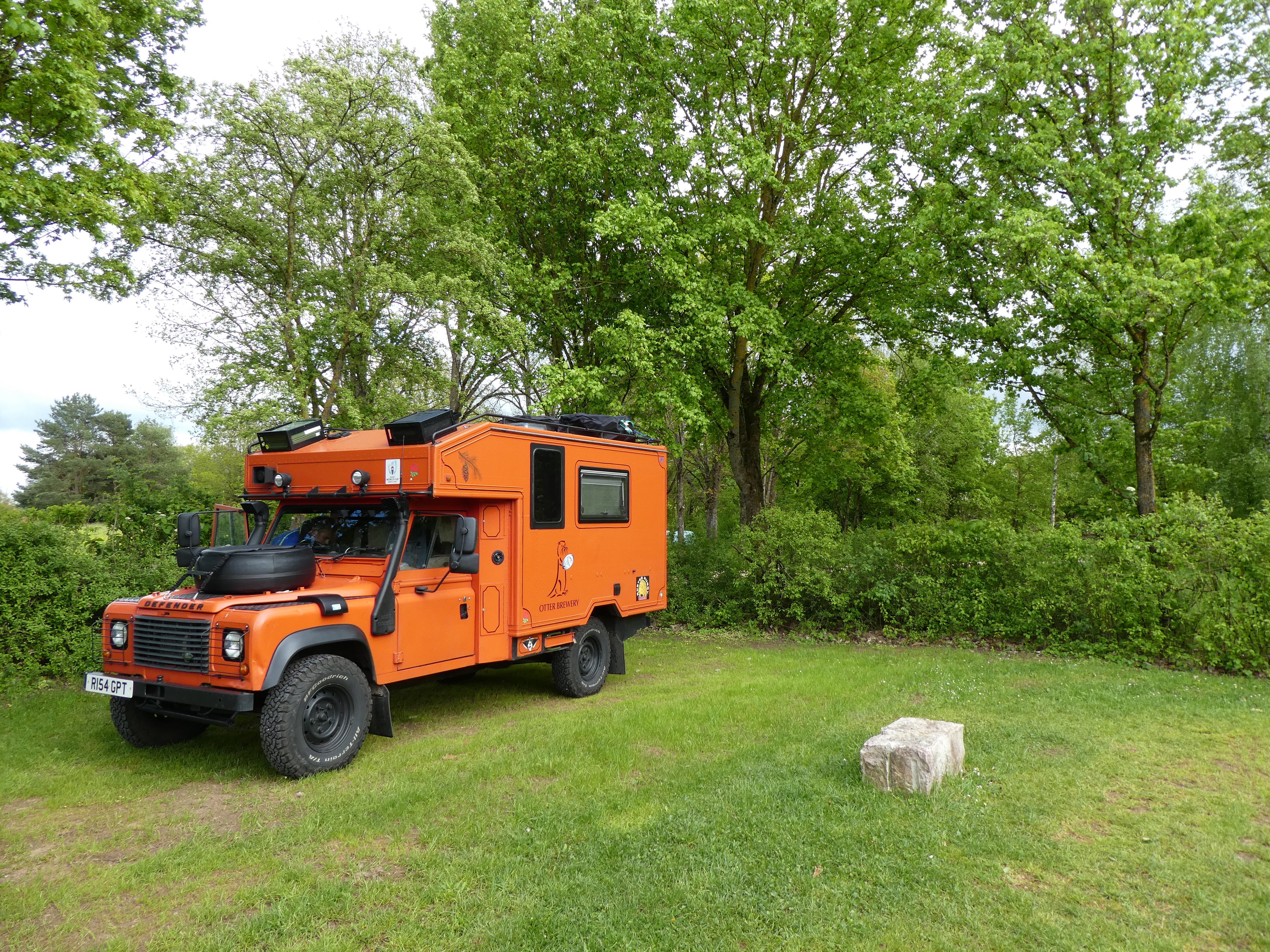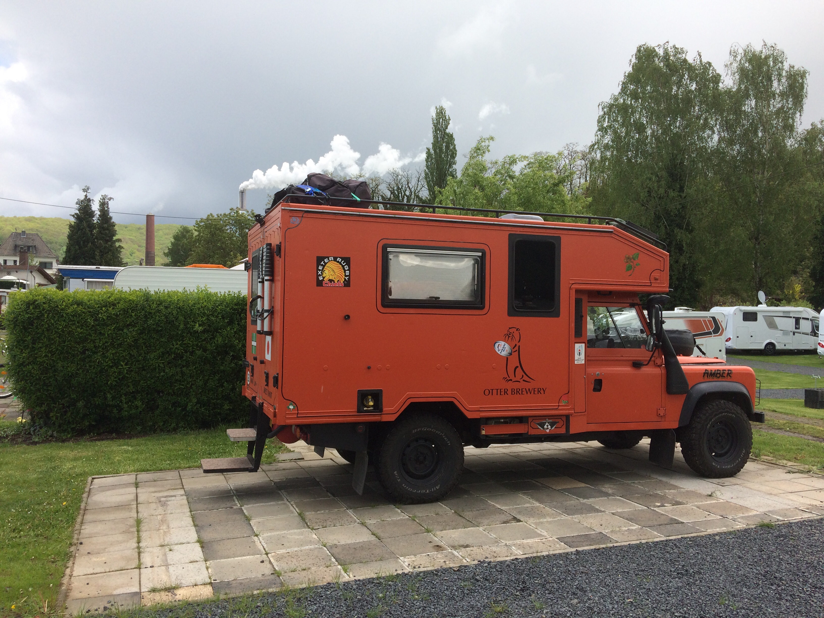 We had been looking at different vehicles for some time and had concluded that an ex-military Landrover Pulse Ambulance, based on a Defender 130 with the respected 300 TDI engine, would suit us down to the ground. As a confirmed Landrover fans, it didn’t take long to convince us this would be the right vehicle for our trip. Being big enough but not too big , comfortable enough but not too comfortable and reliable enough but not too reliable ( I like a challenge). Bought on an online auction without seeing her, she duly arrived and the conversion started in Spring 2016. We have christened her “Amber” the Amber-lance,and a new colour scheme to suit the name was applied in December 2017. ( Otter Amber is also our favourite local beer). She has been used on several shakedown trips and adapted to our own designs and requirements which has allowed us to let her evolve into our mobile home from home.